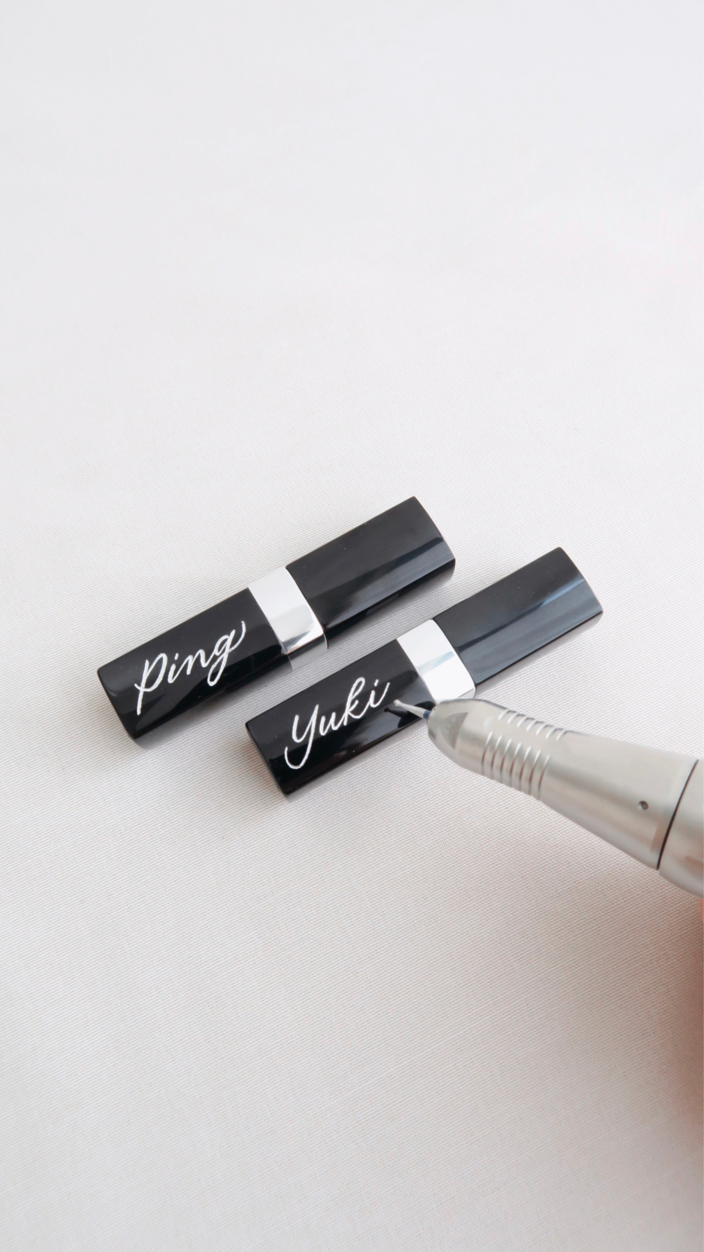 We can engrave on various materials and items with a smooth surface, such as glass, metal, and plastic. Popular items include perfume and cologne bottles, lipsticks, wine bottles, wine glasses and champagne flutes, and more.